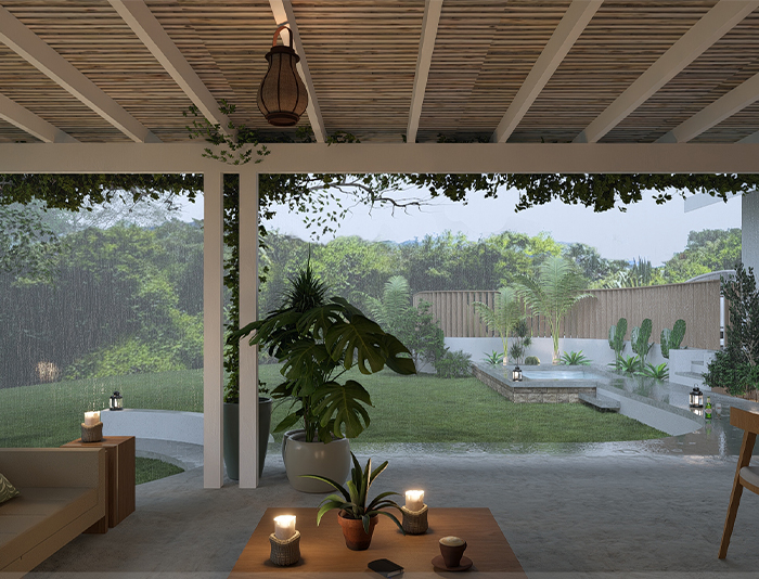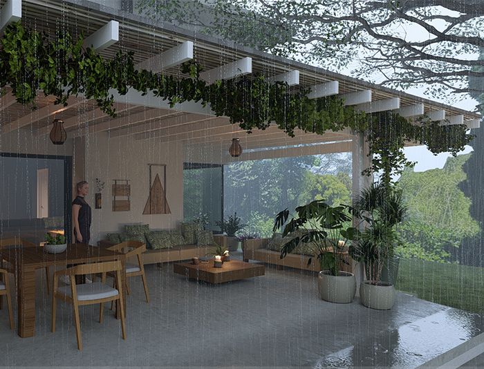 This modern renovation project in Constantia, Cape Town, exemplifies stylish and functional design. The two-story house features large windows and an open-plan layout that seamlessly extends to an inviting outdoor living area. The outdoor space includes a comfortable seating area, dining table, and lush greenery, creating a harmonious blend of indoor and outdoor living. A central water feature adds a touch of tranquility, while the overall design highlights contemporary architectural trends and the integration of natural elements.