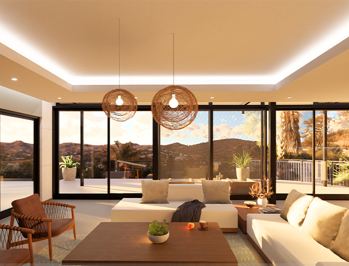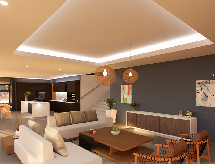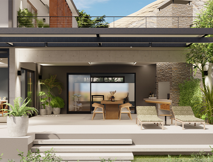Kenneth Main Designs presents a sophisticated and stylish two-story house at Klein Windhoek ERF 1688. The modern architectural design features large glass windows and doors, ensuring ample natural light throughout the interior spaces. The exterior boasts a spacious patio area with outdoor furniture, potted plants, and a well-maintained lawn. The clean lines, flat roof, and combination of concrete, metal, and glass materials create a sleek and contemporary aesthetic, perfectly blending luxury and functionality.