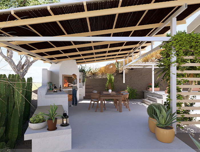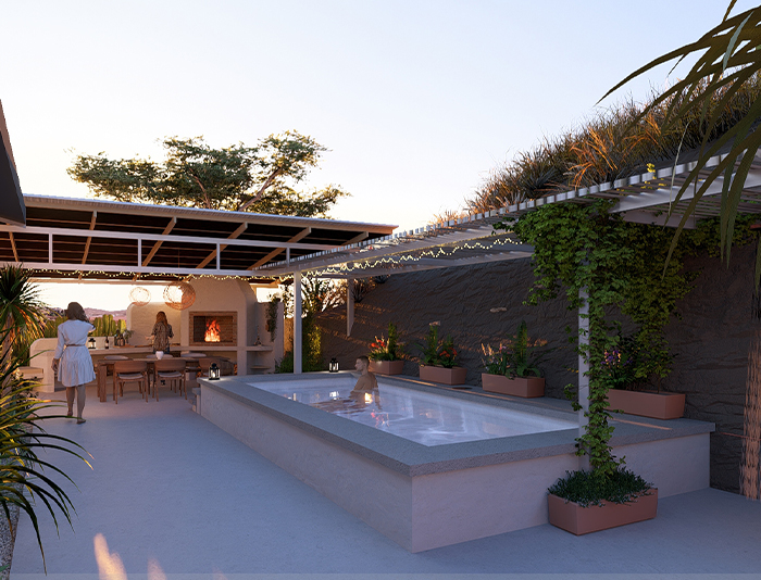 Kenneth Main Designs has created a perfect outdoor living space with this pool and lappa addition. The area features a rectangular pool with a concrete edge, offering a refreshing spot to relax. The lappa, covered with a pergola-like structure adorned with string lights, provides an inviting shaded dining area. Equipped with a table, chairs, and a built-in braai (barbecue) area, it’s perfect for social gatherings. Decorated with potted plants and greenery, the space combines leisure, dining, and aesthetic appeal, making it an ideal backyard retreat.